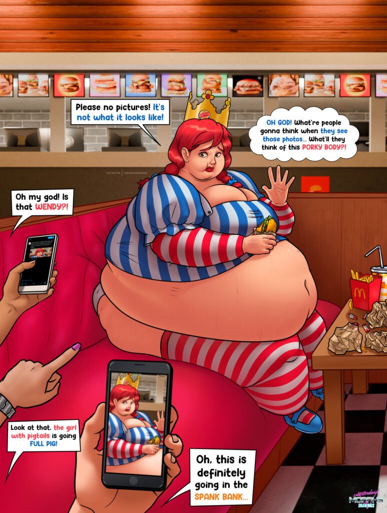 Wendy, once the perky mascot of a famous burger empire, couldn’t resist the call of greasy indulgence. One bite led to another… and another… until the booth could barely contain her bloated belly, bursting buttons, and thick, overfed thighs. The fast food princess has gone full queen-sized—and the cameras caught every glorious inch.